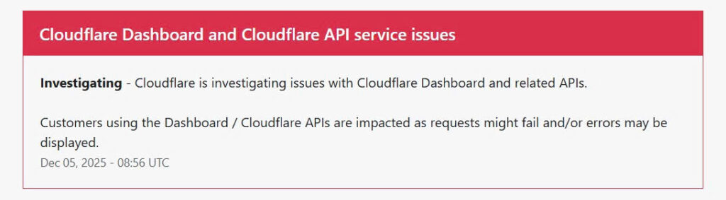 “Cloudflare Dashboard and Cloudflare API service issues” (Sự cố về Bảng điều khiển và các dịch vụ API của Cloudflare)