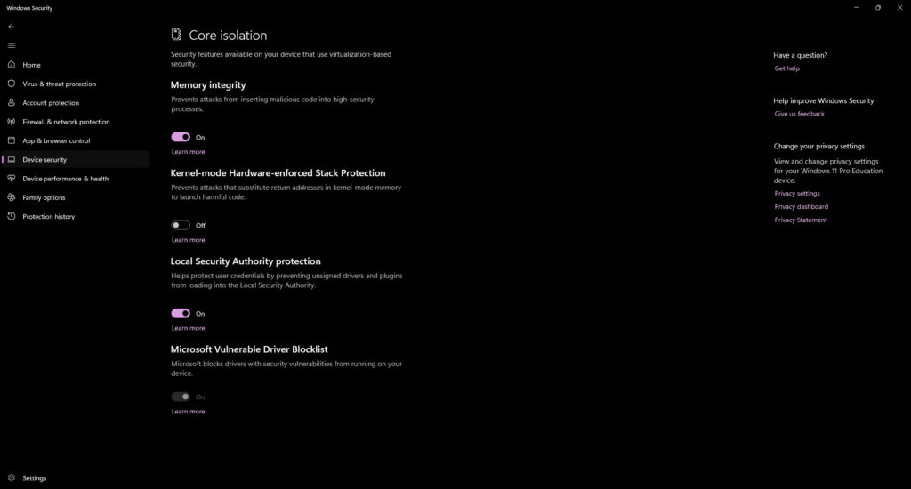 Ở khía cạnh bảo mật, Microsoft tiếp tục yêu cầu các tính năng như TPM 2.0, Secure Boot và Memory Integrity được bật để tăng khả năng chống tấn công từ phần mềm độc hại. Người dùng nên thường xuyên kiểm tra cài đặt trong mục Windows Security → Device Security → Core Isolation, cũng như đảm bảo hệ thống cập nhật tự động.